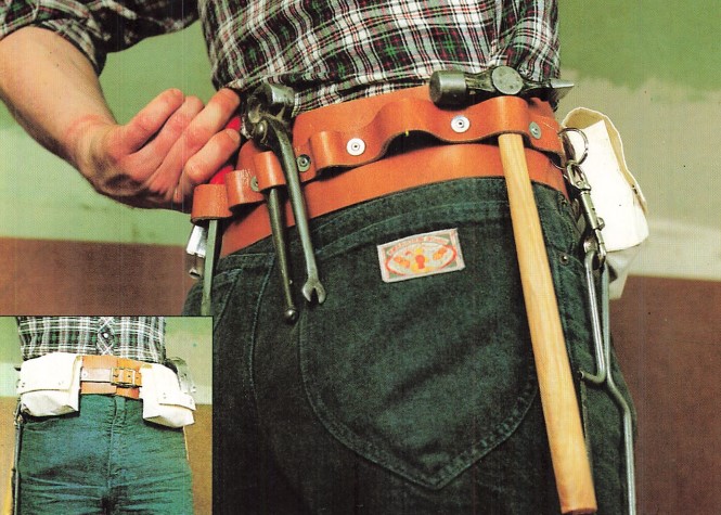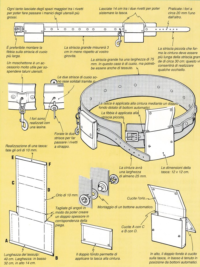 Quando dovete lavorare ad una certa altezza, diventa seccante dover scendere per posare ogni volta l’utensile che state usando; solitamente si ha la tendenza ad utilizzare le tasche, ma non c’è nulla di più pericoloso: potreste ferirvi mentre vi abbassate. La realizzazione di questa cintura è decisamente semplice: su una striscia di cuoio piuttosto larga, tagliata a seconda del vostro girovita, è fissata con alcuni rivetti a strappo una striscia più stretta. Quest’ultima è provvista di una fibbia ad un’estremità, mentre dall’altra parte presenta dei forellini, come una normalissima cintura tradizionale. La striscia di cuoio è fissata a quella più grande in modo da lasciare, tra un rivetto e l’altro, uno spazio sufficiente per farci passare il manico di un utensile, come potete osservare dalla fotografia qui sopra. Inoltre, troverete molto utili due tasche in tela, che utilizzerete per riporre e tenere a portata di mano tutti gli utensili più piccoli. Eccovi dunque una vera cassetta per attrezzi portatile che potrete realizzare molto rapidamente, con l’aiuto di qualche strumento adatto a lavorare il cuoio e dello schema dettagliato che troverete di seguito.